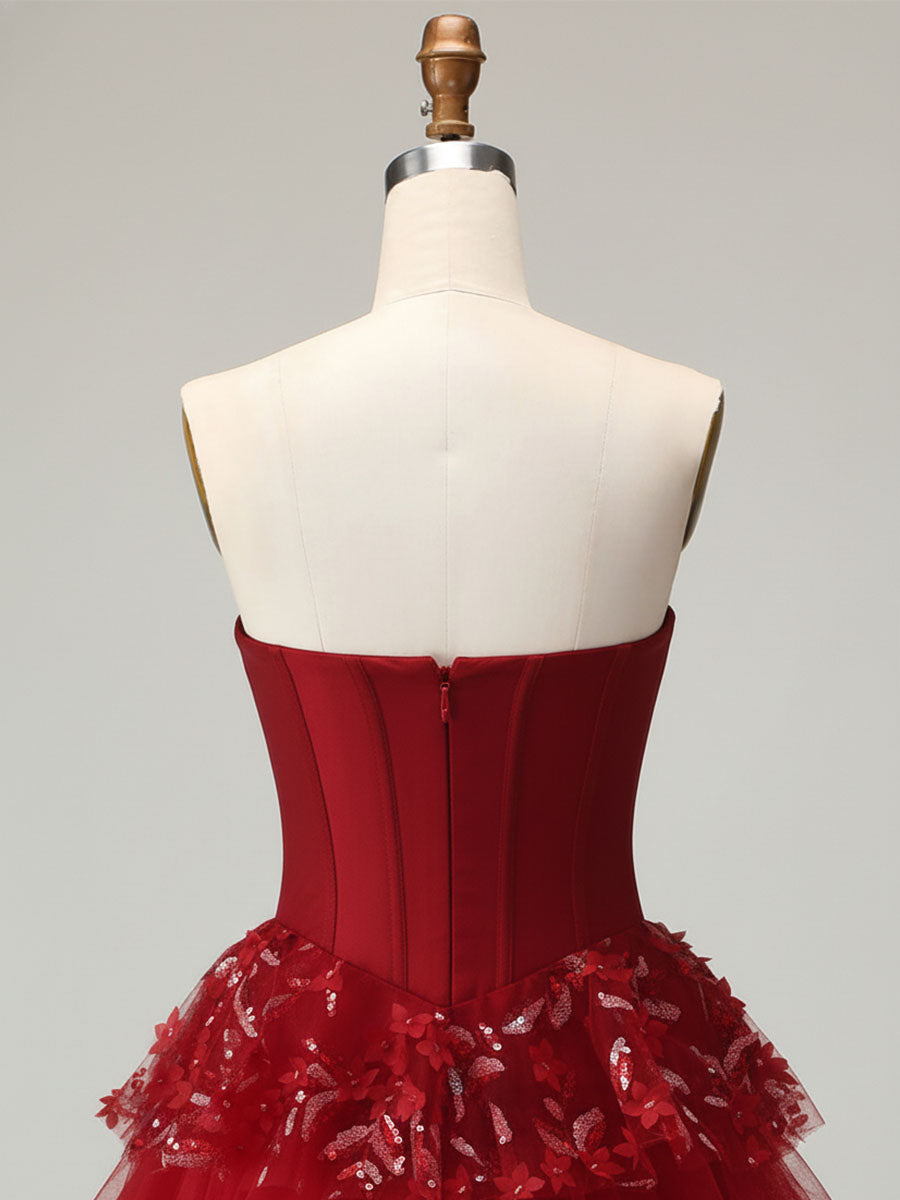 Make an unforgettable. high-drama entrance in this stunning red ballgown. This dress features a romantic sweetheart neckline. accented with a dainty bow. and supported by delicate spaghetti straps. The structured corset bodice. complete with visible boning. sculpts a perfect hourglass figure. The true showstopper is the voluminous. floor-length A-line skirt. crafted from countless cascading tiers of tulle. with each tier lavishly adorned with intricate 3D floral lace appliqués. This gown is a masterpiece of texture and drama. perfect for prom. a gala. or any event where you plan to be the center of attention.